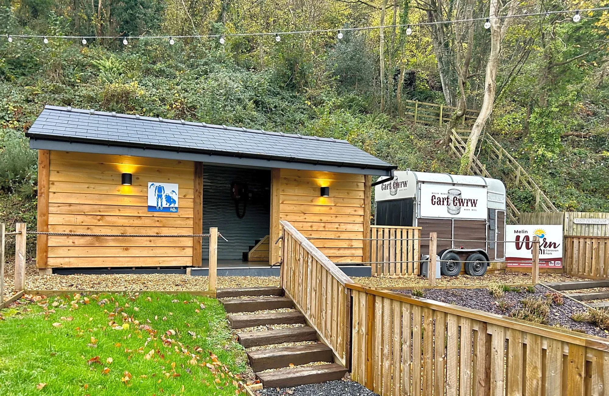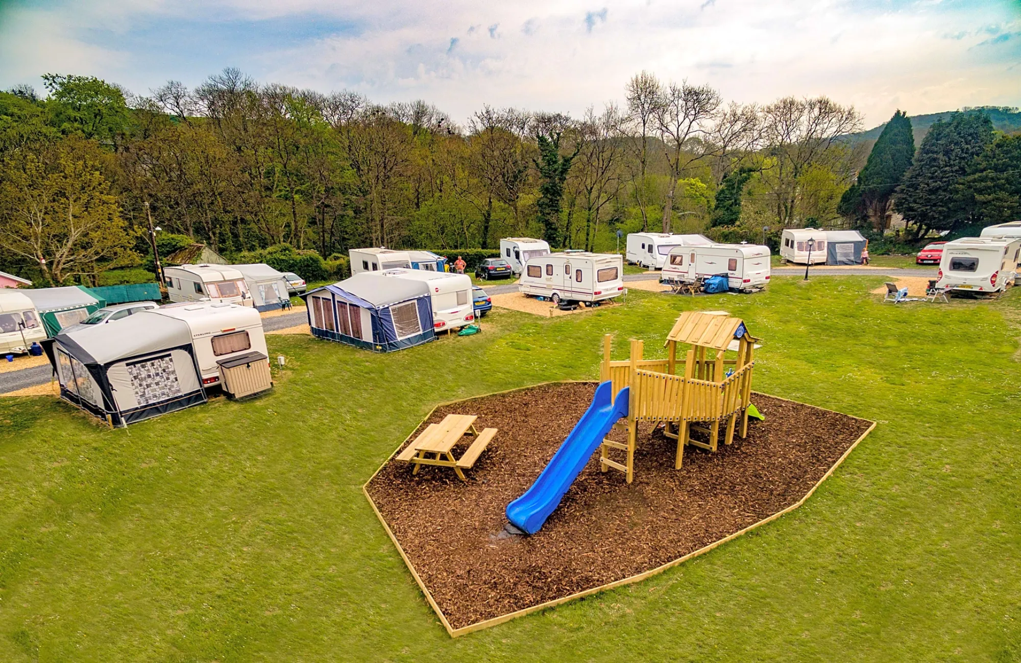 Wern Mill Caravan Park is located next to a quiet stream on the edge of a sleepy village